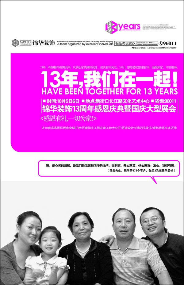 13年來(lái),她服務(wù)了成千上萬(wàn)戶家庭,為他們創(chuàng)造美好居家生活;13年來(lái),她將優(yōu)秀的設(shè)計(jì)、優(yōu)質(zhì)的施工質(zhì)量和服務(wù)帶進(jìn)千家萬(wàn)戶,打造的品質(zhì)家裝獲得了大家的肯定;13年來(lái),從“放心家裝”到“好設(shè)計(jì)”,從“施工標(biāo)準(zhǔn)白皮書(shū)”到“96011客戶服務(wù)熱線”,無(wú)論是設(shè)計(jì),質(zhì)量還是服務(wù),她總是走在家裝行業(yè)的前沿,她就是錦華裝飾。